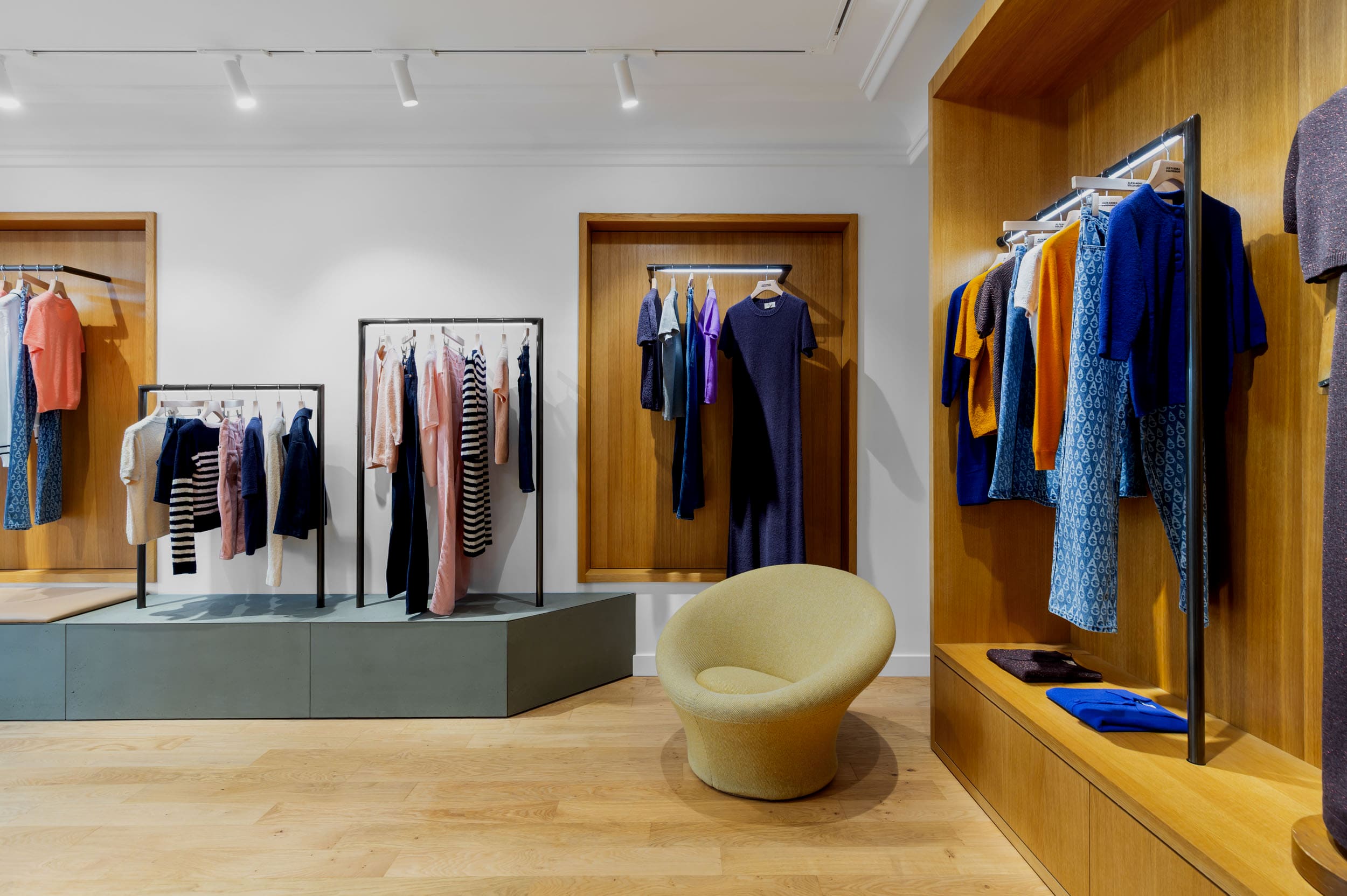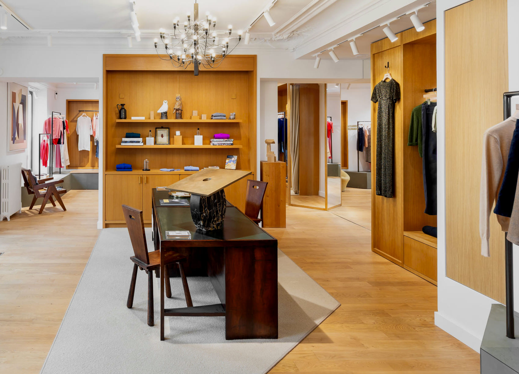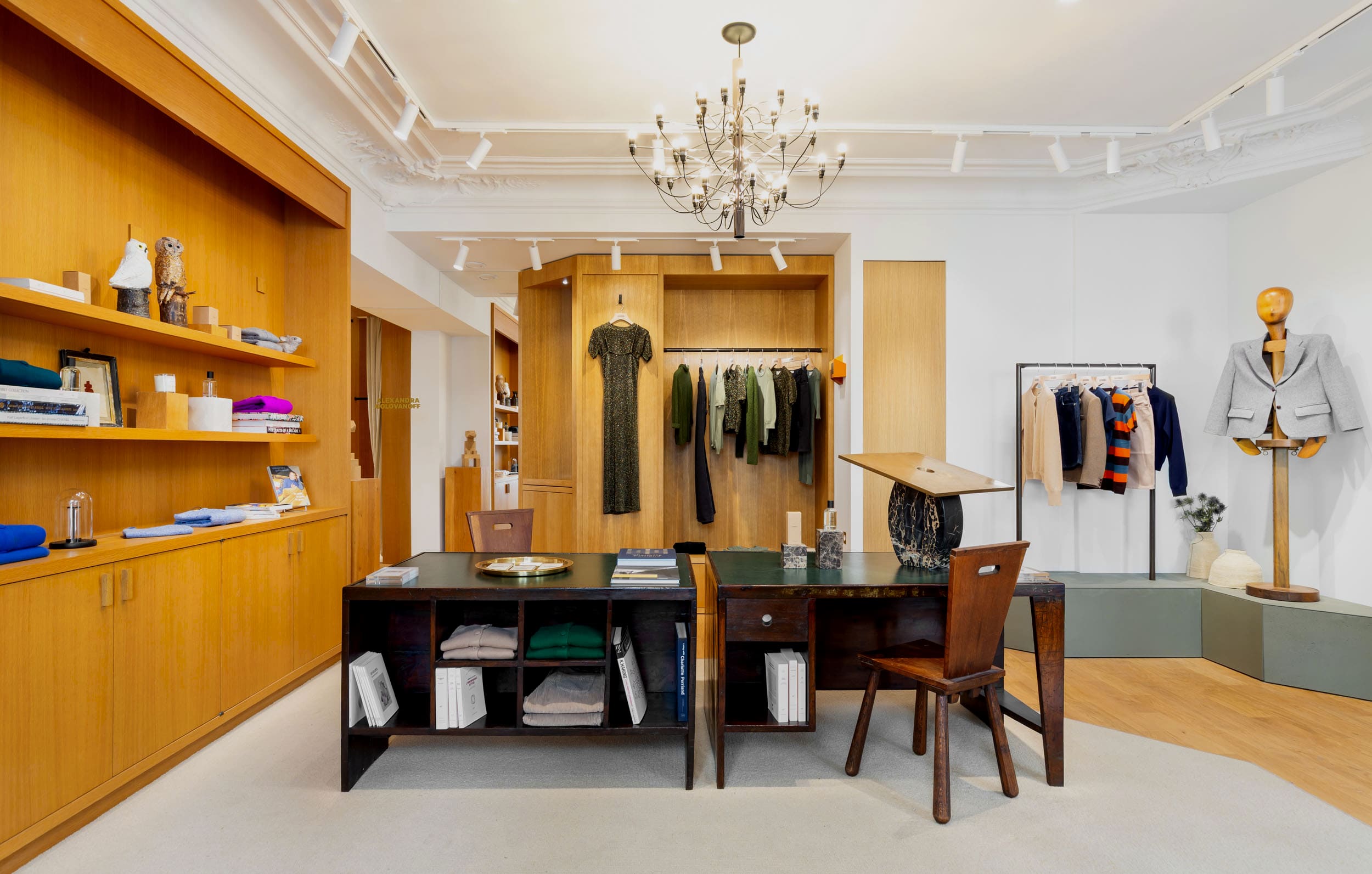 Entre mode, design et art de vivre : la boutique accueille également une sélection de pièces de mobilier d’architectes du XXᵉ siècle choisies en collaboration avec Laffanour | Galerie Downtown, ainsi que des œuvres issues de la collection personnelle d’Alexandra. Cette hybridation transforme l’adresse en une destination singulière où mode, design et art de vivre se rencontrent.