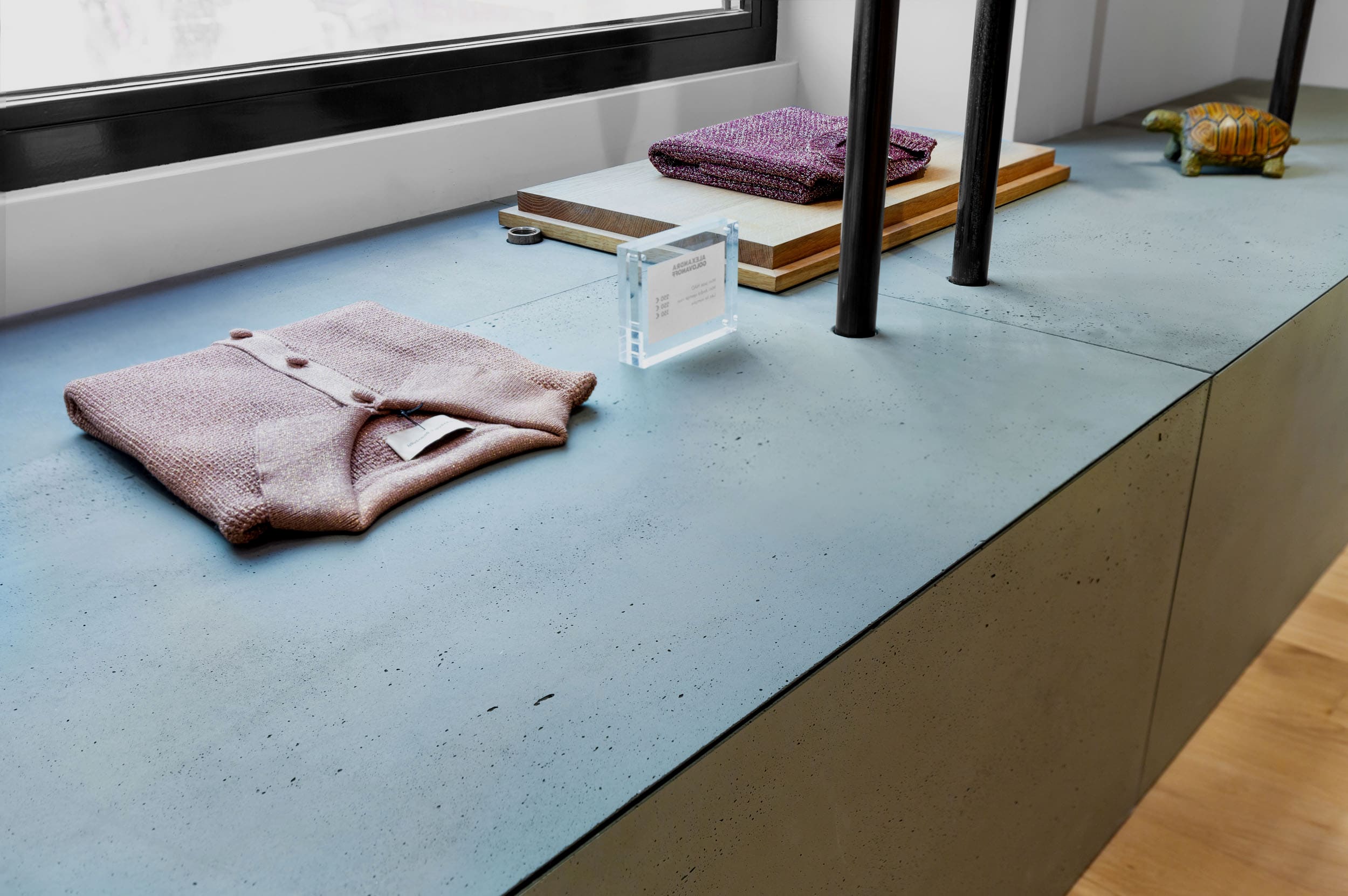 Un manifeste architectural et sensoriel : pensé comme un manifeste, ce lieu à l’identité forte conjugue matières brutes et légèreté raffinée. De grands monolithes en bois habillés de béton fibré structurent l’espace, tandis qu’une scénographie aérienne, portée par de fines tiges métalliques, introduit un contrepoint tout en délicatesse. Le chêne français brut répond au béton contemporain (Slimbeton® par Concrete LCDA), créant un dialogue entre artisanat et innovation. Le mobilier évolutif accompagne les temps forts de la saison : tantôt supports des collections, tantôt assises. Fabriqué localement et dessiné sur-mesure, il prolonge l’exigence d’épure et de singularité qui caractérise l’univers d’Alexandra Golovanoff Paris.