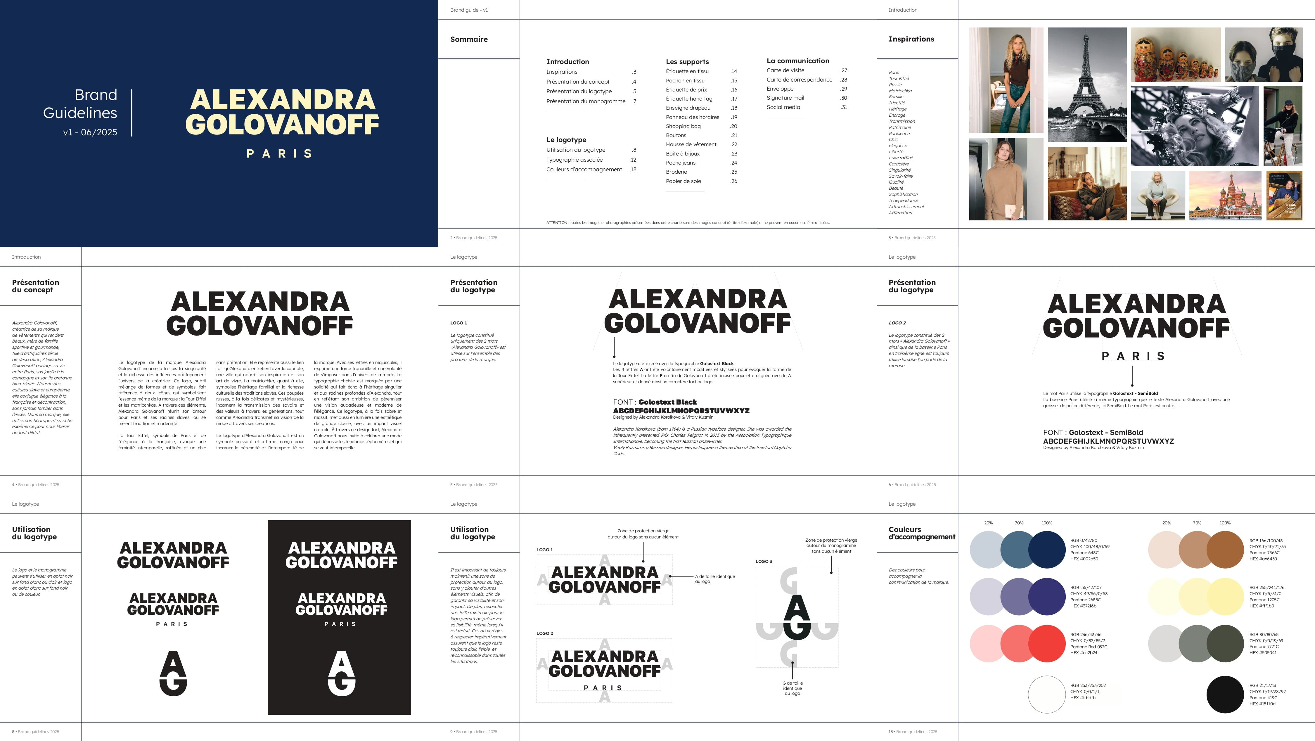 Une identité visuelle et graphique complète : en parallèle de l’architecture, BRIO a conçu la nouvelle identité visuelle et graphique de la maison. De la création du logo et des ses déclinaisons à l’ensemble des applications la nouvelle charte graphique incarne l’élégance contemporaine et l’esprit singulier d’Alexandra Golovanoff Paris. Un monogramme inédit incarne particulièrement cette histoire de famille : un "A" stylisé, évoquant la tour Eiffel, s’inscrit dans un "G" partiel, clin d’œil discret aux origines slaves des deux sœurs. À l’image d’une matriochka, ce signe graphique associe héritage et modernité, prolongeant dans l’univers visuel l’exigence de cohérence du concept architectural.
